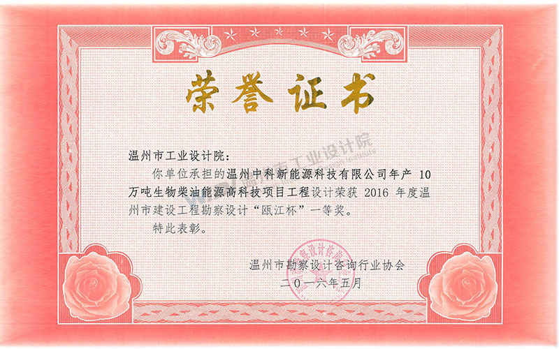 溫州中科新能源科技有限公司年產(chǎn)10萬噸生物柴油能源高科技項(xiàng)目 甌江杯一等獎